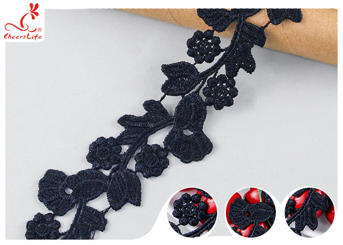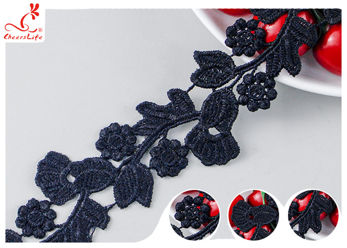 Black Floral Embroidery Lace Trim Via Water Soluble With High Color Fastness Dye